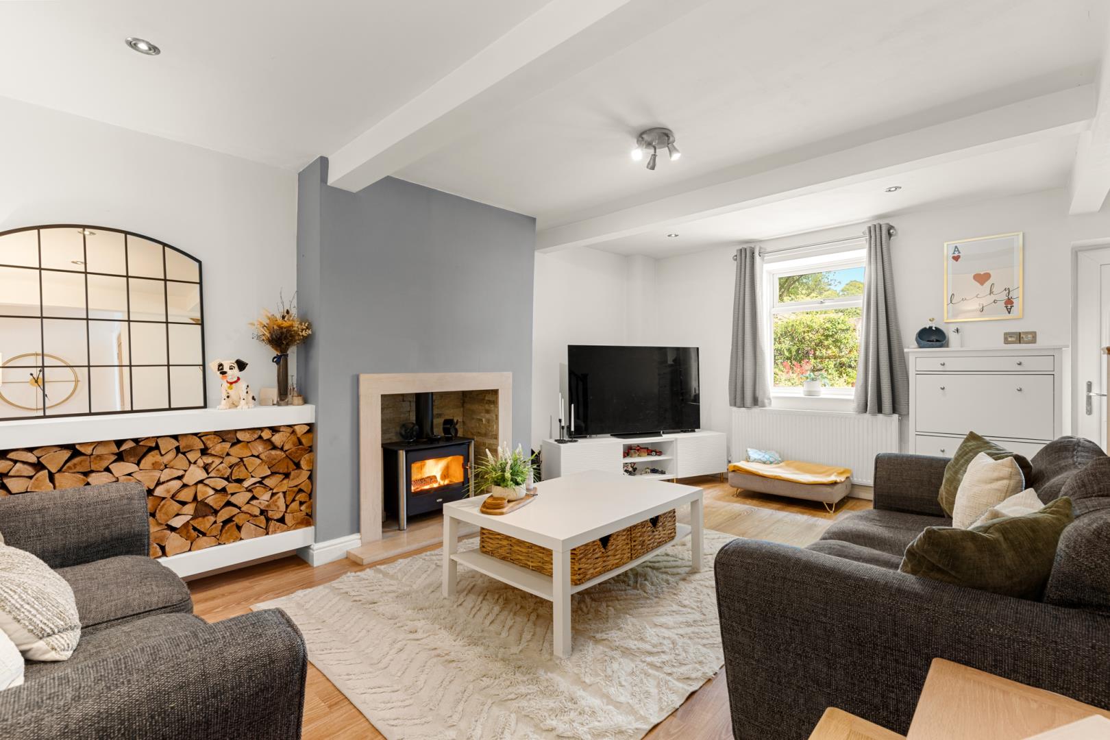Tastefully done, the first thing that drew my eye was the fabulous limestone surround log burner, a stand out feature that brings the entire home together, the soul of the home. Then the neatly stacked wood storage wall stood out and was a great talking point, it gives the room character. The beautiful oak banister with matt black steel spindles and the oak doors, very stylish and compliments the immaculately finished walls. Within minutes I was instantly imagining myself excited to come home, lighting the candles, lighting the fire, jumping on the couch and getting my favourite series on and chill.